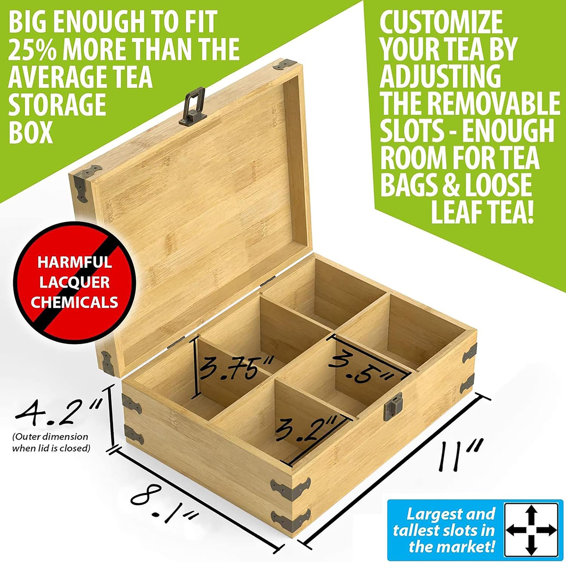 Big Spacious Compartments - Tea bags come in different shapes and sizes. Our wooden boxes have removable - oversized - slots to fit all the bags in your tea collection. You can arrange them standing vertically for easy browsing. Overall Outside Dimensions: 11.1” L x 8.1" W x 4.2” H